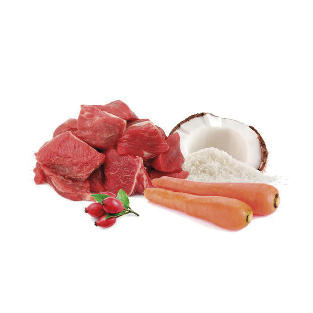 Carne de músculo de vacuno (60,2%), corazón de vacuno (15%), pecho de ternera (10%), bazo de ternera (5%), hígado de ternera (5%), zanahoria (2,4%), coco, cáscara de escaramujo BIO, levadura desamargada de cerveza, aceite de hígado de bacalao, ascophyllum nodosum BIO (algas marinas).