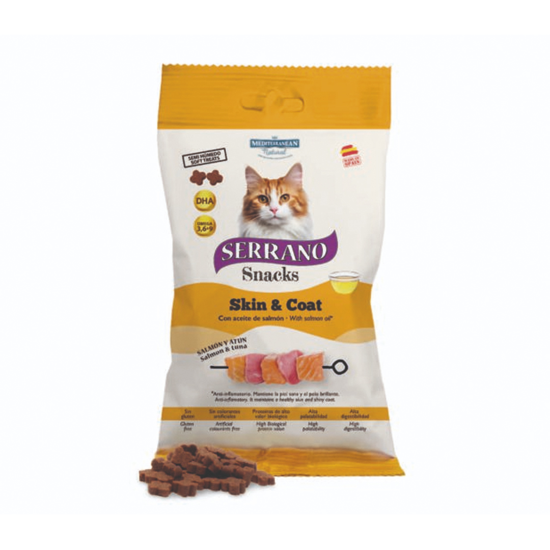 Mediterranean Natural Cat Snacks Extra Omega 3 de Salmón y Atún son premios semihúmedos para gatos, elaborados con una cuidada combinación de pollo, pavo, salmón y atún, y cocinados a baja temperatura para conservar todo su valor nutricional y su sabor natural.