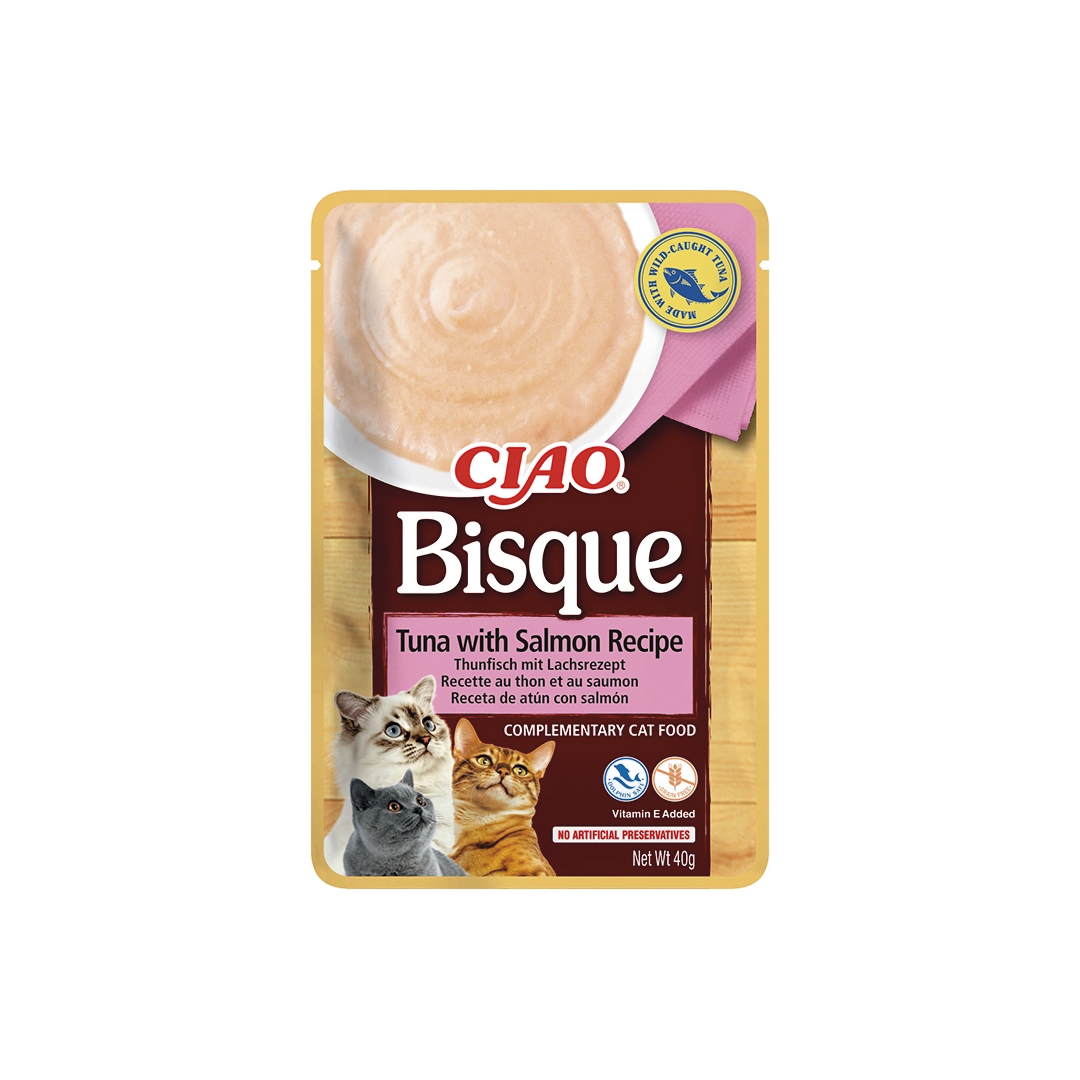 Si a tu gato le encantan los churus, seguro que también estos purés le encantarán. Ciao Bisque puré de atún con salmón es un complemento alimentario en textura crema/puré tipo churu elaborado con pescado de pesca responsable.