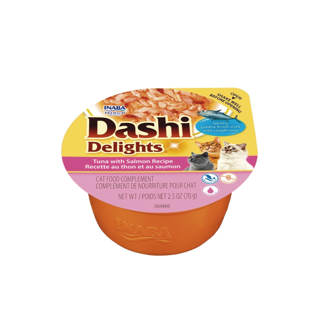 El Ciao Dashi Delight Atún con Salmón en Caldo es un alimento húmedo complementario para gatos, elaborado con atún de alta calidad y un toque de salmón en un auténtico caldo Dashi japonés. Este caldo, a base de vieiras y virutas de bonito seco, aporta un sabor umami intenso que encantará a tu gato. Perfecto como premio o complemento de su alimentación habitual, ayuda a mantener a tu felino hidratado y satisfecho, con una textura de filetes de atún deshilachados en caldo que resulta muy apetecible.