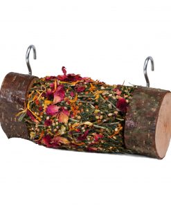 El tronco está elaborado con madera natural y relleno de flores y hierbas que encantan a conejos y roedores como las flores de caléndula, el perejil o los pétalos de rosas. Un snack saludable que también enriquece su dieta.