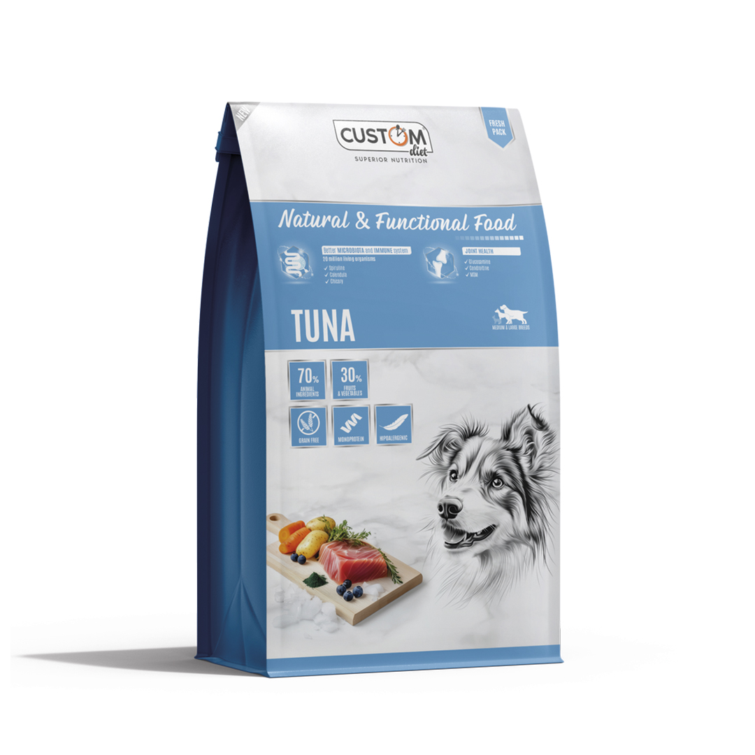 Custom Diet Atún es un pienso natural sin cereales diseñado para perros adultos que buscan una alimentación rica en proteínas de alta calidad y equilibrada. Su receta combina atún deshidratado, anchoveta, melva y albacora, ofreciendo un 70 % de ingredientes de origen animal, con un 30 % de frutas y verduras frescas que aportan fibra, vitaminas y antioxidantes.
