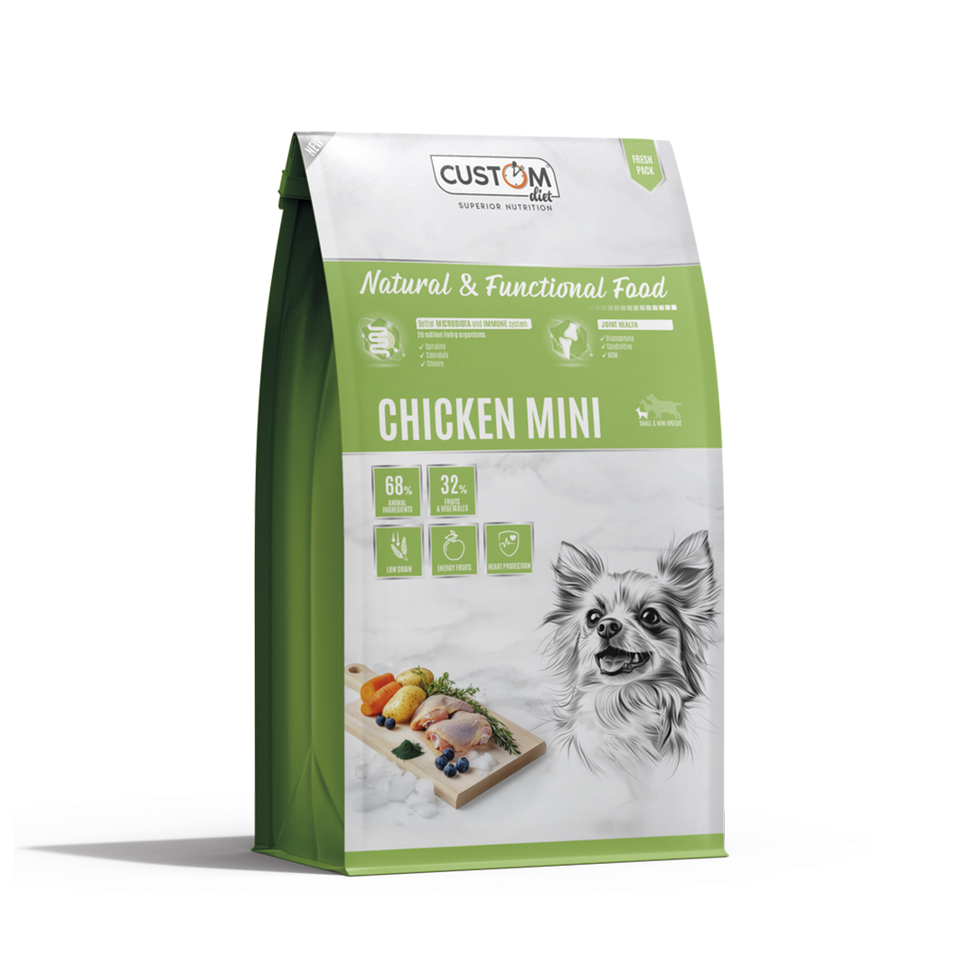 Custom Diet Pollo Mini es un pienso natural elaborado con ingredientes de alta calidad, especialmente formulado para perros de razas pequeñas o mini. Su receta, con un 49% de pollo deshidratado como fuente principal de proteína animal, ofrece una nutrición completa, sabrosa y fácil de digerir, ideal para mantener su energía y vitalidad diaria.