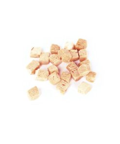 Un snack natural y altamente nutritivo elaborado con un 90% de pollo y 10% de zanahoria, cuidadosamente liofilizado para conservar todo su sabor y valor nutricional. Su textura ligera y crujiente lo convierte en un premio irresistible tanto para perros como para gatos, ideal como recompensa saludable en cualquier momento del día.