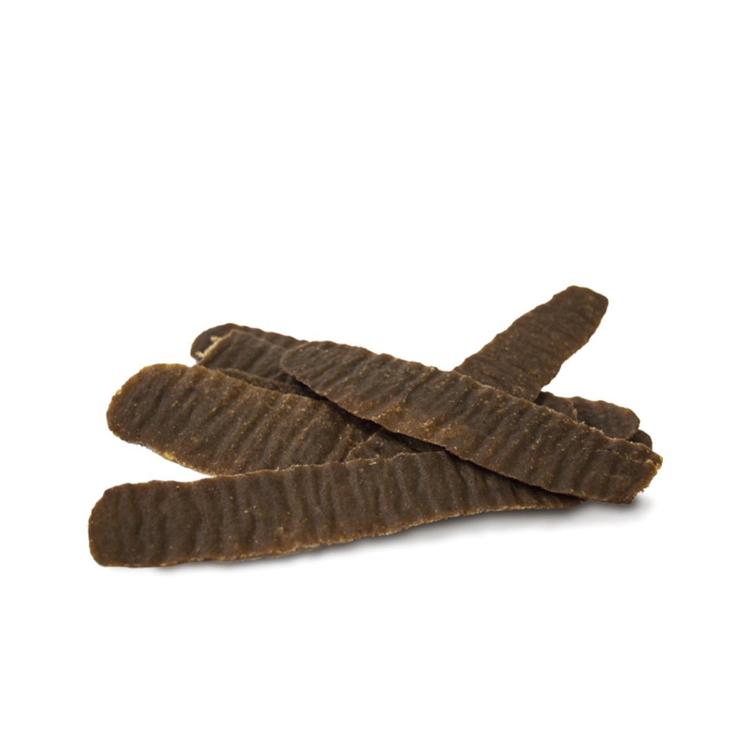 Su textura tierna y formato en tiras finas permite cortarlas fácilmente en porciones más pequeñas, ideales para sesiones de entrenamiento o como premio saludable. Además, la acción de masticar contribuye a favorecer la salud bucodental, ayudando a reducir placa y sarro de manera natural, mientras el animal disfruta de un snack sabroso y nutritivo.
