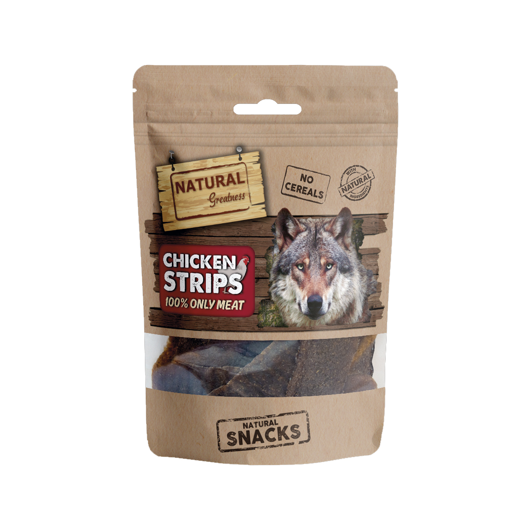 Deliciosas tiras Natural Greatness de pollo de grado humano, deshidratadas a baja temperatura para preservar todos sus nutrientes y su sabor natural. Este snack monoproteico y sin cereales es hipoalergénico y una excelente fuente de proteína magra, altamente digestible, incluso para perros y gatos con digestiones sensibles.