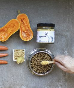 Superyellowkun es una mezcla de superalimentos que ayudan a favorecer el bienestar gastrointestinal. Este suplemento Aporta fibra con propiedades prebióticas que regulan el tránsito intestinal, además de proteger y calmar el estómago. Superyellowkun contiene la combinación de superalimentos ideal para hacer frente a los trastornos estomacales e intestinales de perros y gatos.