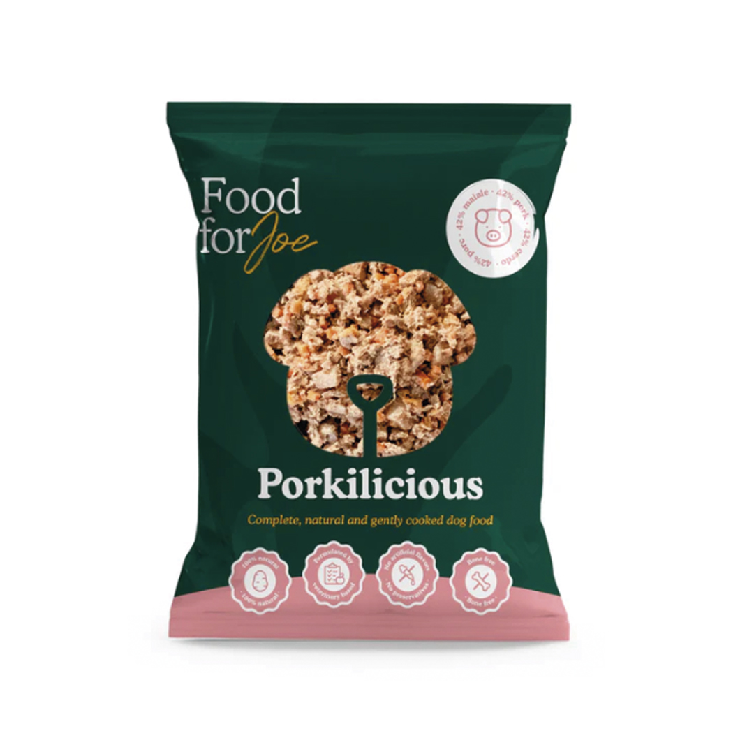 Food for Joe Porkilicious es un menú natural completo para perros, elaborado con cerdo fresco como única fuente de proteína animal y acompañado de verduras y frutas seleccionadas. Una receta deliciosa y equilibrada que aporta proteínas de alta calidad, energía y un sabor irresistible incluso para los paladares más exigentes.