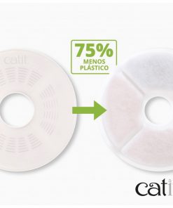 Los filtros de recambio de triple acción para las Fuentes Catit contienen una resina de intercambio iónico el cual suaviza el agua dura al eliminar el magnesio y el calcio logrando así un agua más sana para tu mascota. Además contiene carbón activo el cual absorbe las impurezas del agua como alimento, pelo, sedimento y también elimina los olores de cloro, de éste modo tu gato tendrá agua limpia y pura.