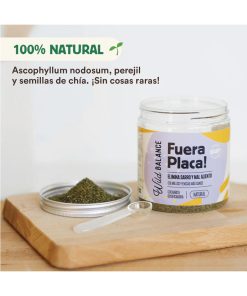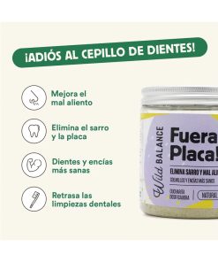 Wild Balance Fuera Placa es un suplemento 100% natural en polvo elaborado principalmente con alga Ascophyllum nodosum, que ayuda a reducir la placa bacteriana y el sarro, además de mejorar el mal aliento de tu mascota. Su fórmula incluye también perejil, que refresca el aliento, y calcio, que contribuye a mantener los dientes fuertes y sanos.