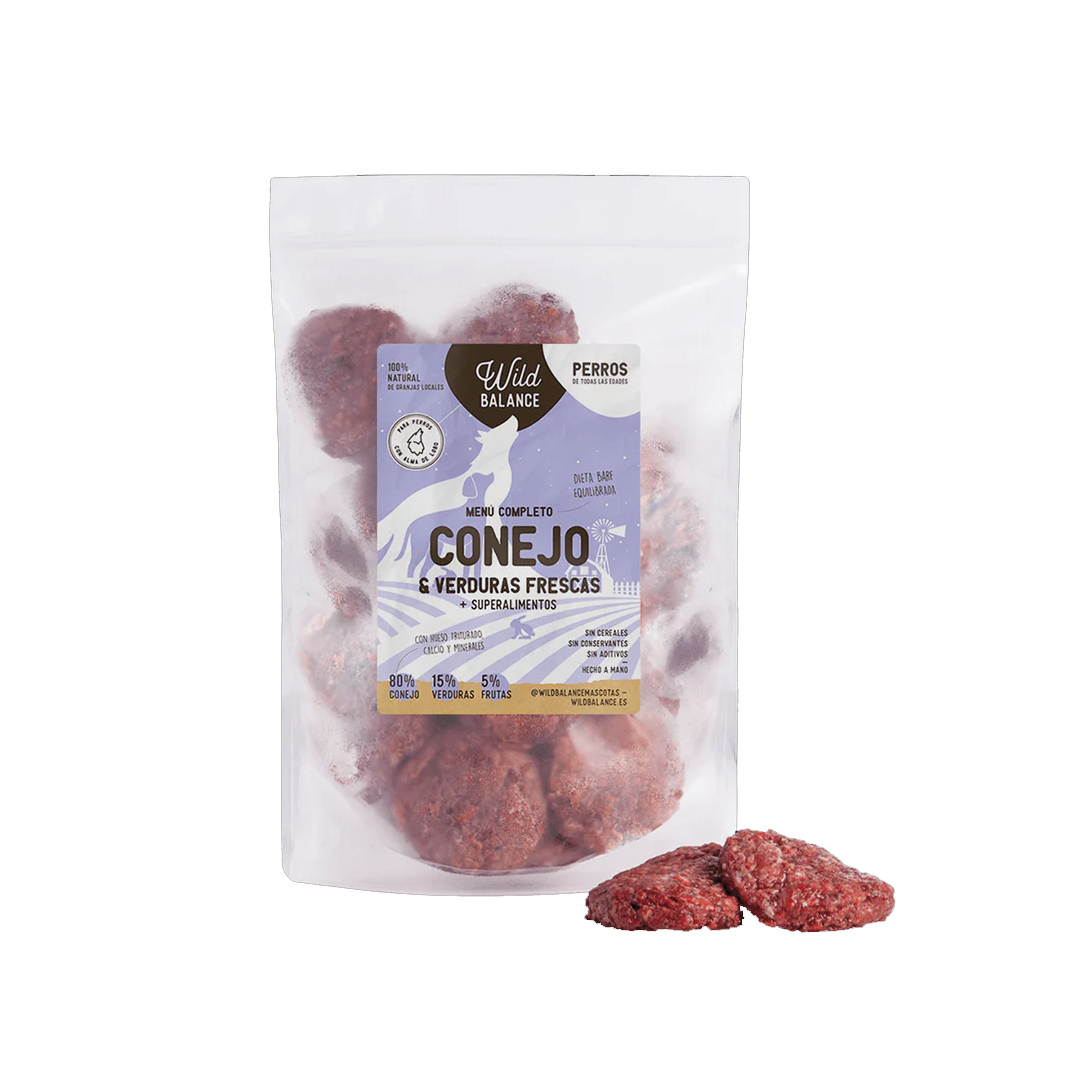 Wild Balance Menú de Conejo con verduras frescas es un menú completo de dieta BARF congelado, ideal para perros que necesitan una alimentación natural y altamente digestible. Elaborado con conejo como única fuente de proteína animal, es perfecto para perros con alergias o intolerancias a proteínas más comunes.