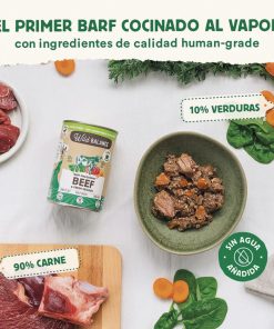 Una receta sabrosa, nutritiva y 100 % natural elaborada con ternera fresca cocinada al vapor a fuego lento, siguiendo la filosofía BARF 🍲🐶. Este método de cocción suave conserva todo el sabor auténtico de la carne y los vegetales, manteniendo intactos los nutrientes esenciales. Su textura tipo guiso con trozos visibles hará las delicias de tu peludo cada día 😋💛.